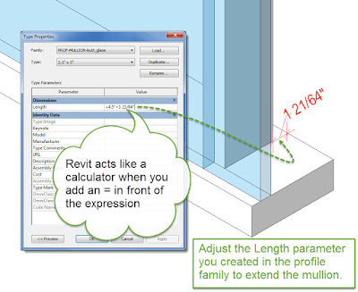 I find few people know this little tidbit. Adding an equal sign in front of an expression turns Revit into a calculator. You can use this little trick almost anywhere you have a dimension. That means you don't have to guess what 4.5" + 1 21/64" to adjust the length of this mullion. You can let Revit do the math for you.