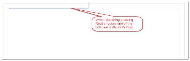 When you create a ceiling, Revit wants to host the boundary of that ceiling to the walls that define the space. It does not matter which method you choose to create the ceiling, Revit will host the boundary of the ceiling to the walls. The difference is when you SKETCH a ceiling in a space with unjoined collinear walls, Revit chooses one to host to leaving the other one free to move. Now you may be thinking this isn't a big deal, but keep reading the payoff is coming.
