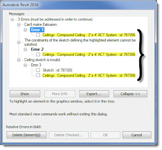 If you're not sure which ceilings are affected you can expand the tree in the warning dialog and all the affected elements are listed there. Checking the box and clicking the "Show" button will take you right to the ceiling.